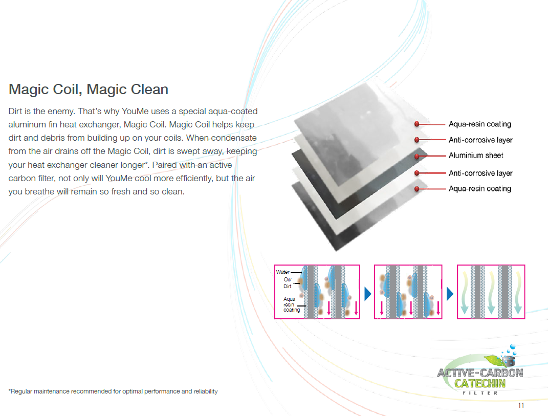 The outlook of the YouMe is stylish and curvy, the curve are just so seamless! The redesign of the aircon indoor unit has make signification improvement for a easier servicing and maintenance by your trusted professional serviceman. The self clean function again is a must have to keep your aircon blower and coil cleaner for a long time. The magic clean like what Mitsubishi Electric offer, has a hydroponic surface coating that drains off water/dirt/oil when the water drips through. Using water as the maintenance is the best recommendation as chemical (acid/alkaline) will just damage the coating. Toshiba Carrier truly has design an aircon with environment in mind and with consumer at heart. It will definitely be one of my choices if price and capacity are right.